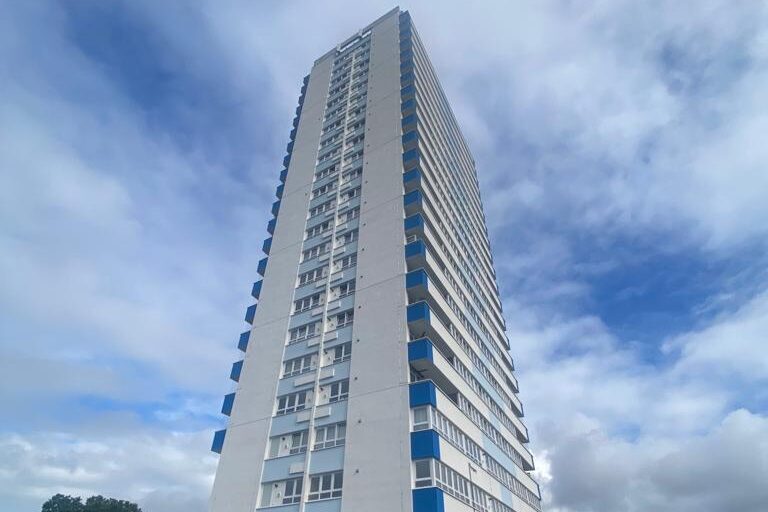 The scope of works included the installation of a new A1 fire-rated external wall insulation (EWI) system, replacement of windows and balcony doors to improve energy efficiency, and essential fire-stopping upgrades within communal areas and key interfaces with external elevations.